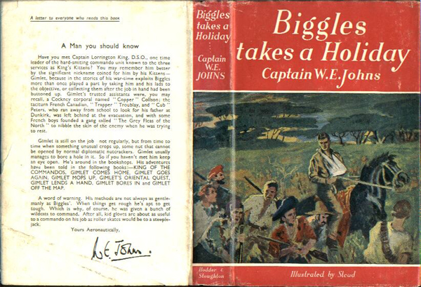 5th impression reprint. Red boards with black titles on the spine and cover and vignette in black of panther. Single tinted frontispiece and 7 single tinted illustrations by Stead. Pictorial dustjacket. Book list after contents page lists 15 Biggles, 5 Worrals and 8 Gimlet titles. Price 7/6.